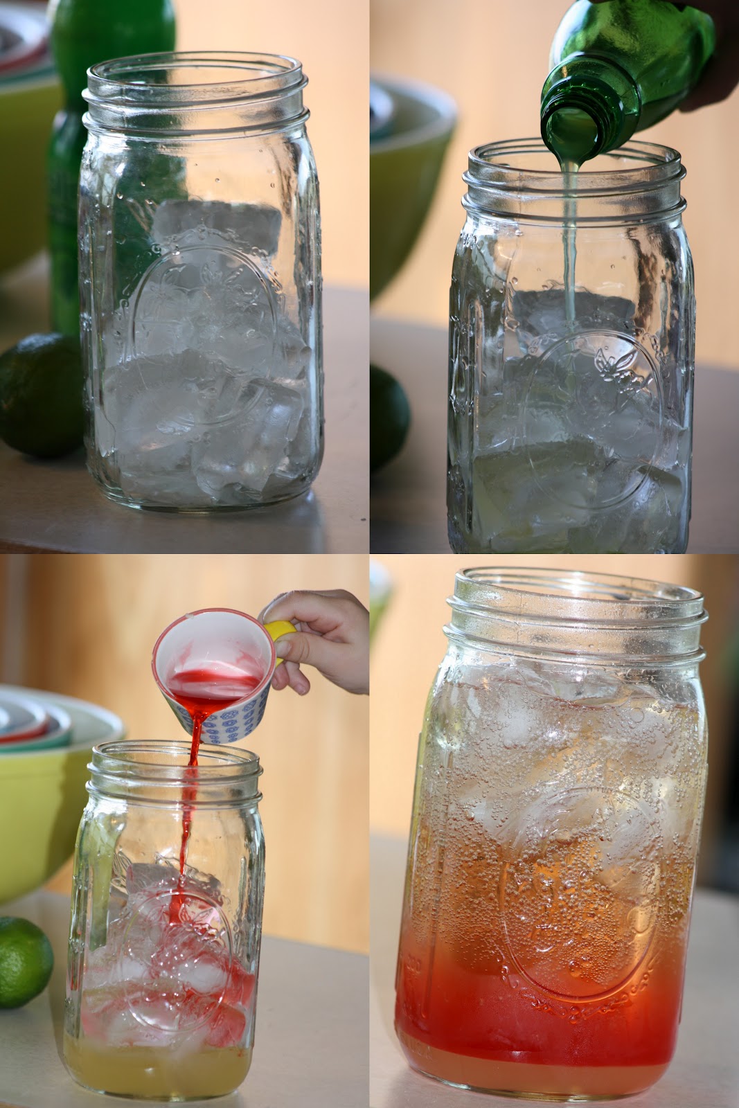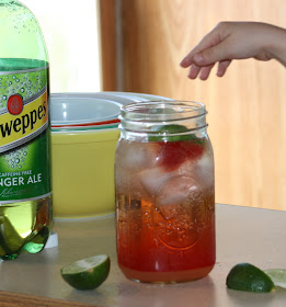 Okay, now for the fun part. Fill a quart size mason jar with ice to the top. Add about 1/4 cup of the lime syrup and 1/4 cup of cherry juice. Pour Ginger Ale on top of that. Its starting to look like a real cherry lime-aide now!