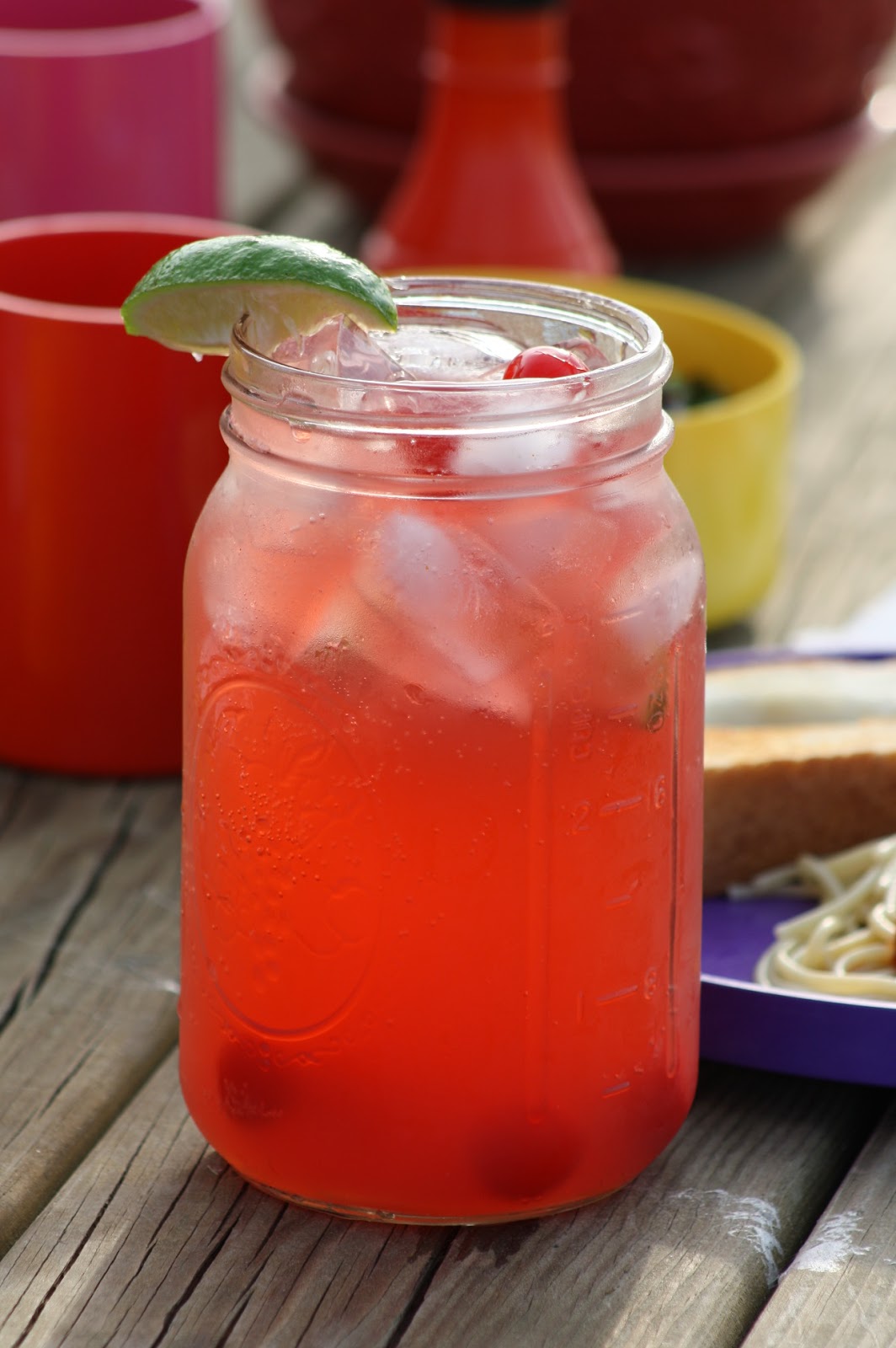 Then add a few lime slices, stir and drink immediately! (If you don't like cherries, you can leave them out and make a plain lime-aide instead. Just as yummy.)